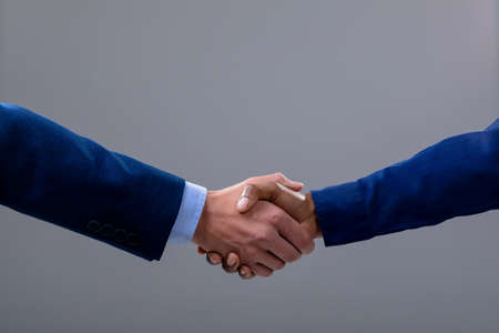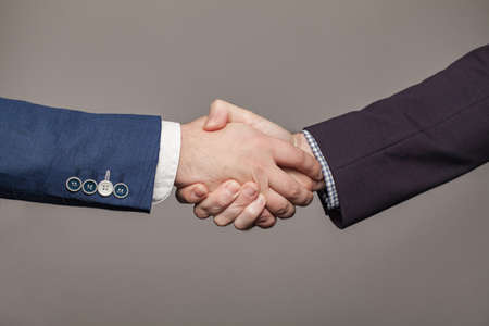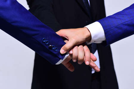 Businessmens hands wearing formal wear on grey background. Coworkers or partners shake hands for cooperation and deal. Business partnership and agreement concept. Company leaders put hands making team