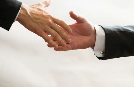 Businessmen in suits reach out to each other for handshake, help, deal, Finance