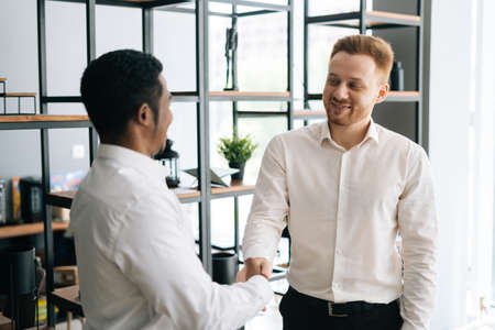 Unrecognizable African American stock trading specialist and his Caucasian client making deal and doing handhsake