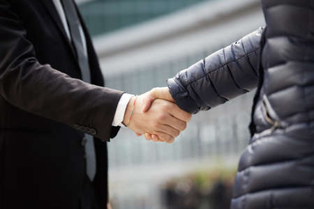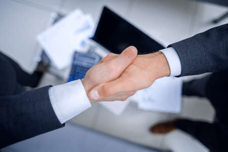 Close up of Business people shaking hands, finishing up meeting, business etiquette, congratulation, merger and acquisition concept
