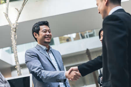 Attractive Asian businesswoman shakes hands with a successful male entrepreneur in the business meeting. Male boss shakes hands and welcomes the new female employee.