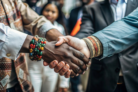 People of different nationalities shake hands, symbolizing peace, unity, and respect. Peace concept