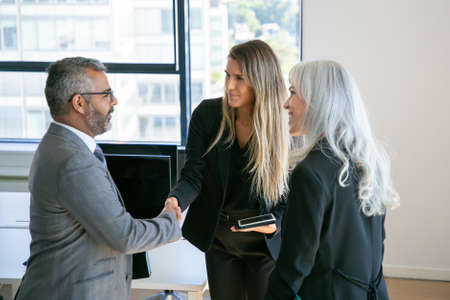 Confident business partners meeting in office, standing and shaking hands, talking, discussing collaboration. Medium shot. Communication or partnership concept