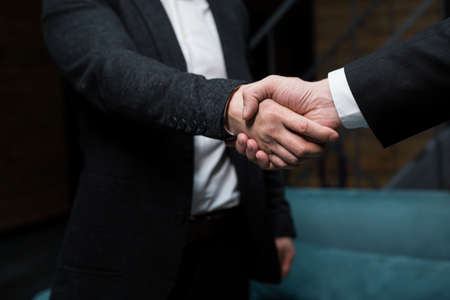 Close up view of business partnership handshake concept.Photo of two businessman handshaking process.Successful deal after great meeting.