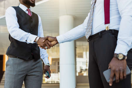Greeting and handshake of two afro american businessmen partner against the backdrop of a modern building exterior. Friendly meeting outdoors