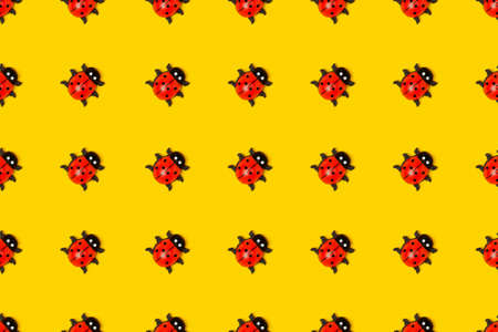 Seamless pattern made with ladybugs on yellow background, as backdrop or texture. Bright summer wallpaper. Top view flat lay.