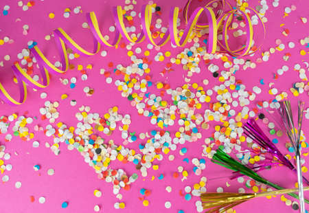 Colorful confetti and streamers scattered on a vibrant pink background, creating a festive and joyful atmosphere.