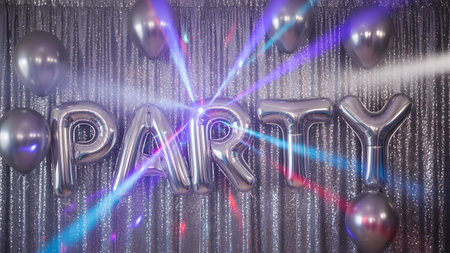 A vibrant and energetic party scene featuring silver foil balloons spelling out PARTY against a shimmering metallic streamer backdrop, illuminated by colorful disco lights creating a dynamic atmosphere.