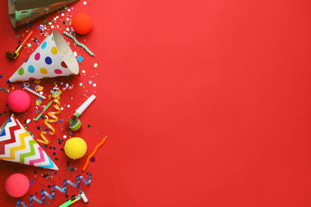 Beautiful flat lay composition with festive items on red background, space for text. Surprise party concept