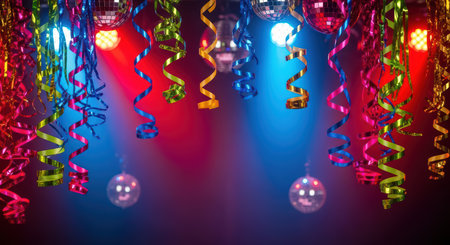 Colorful party streamers and disco balls under vibrant lights