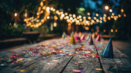 A vibrant party scene featuring colorful hats, confetti, and sparkling lights on a wooden table, creating a joyful atmosphere perfect for celebrations and gatherings.