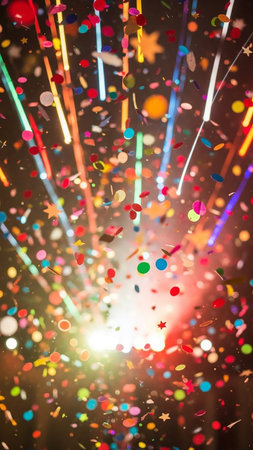 A vertical burst of colorful confetti and bright light streaks creates a dynamic and festive celebratory atmosphere with bokeh.