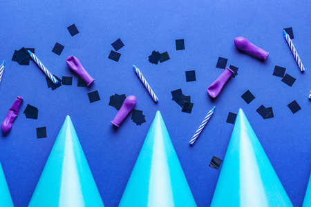 Night party concepts with colorful confetti paper and other props on dark background.celebrate design material