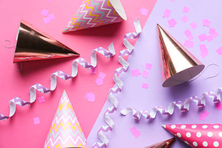 Composition with party hats on color background