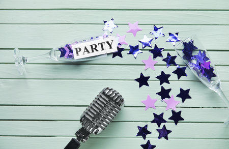 Microphone with confetti and champagne glasses on color wooden background