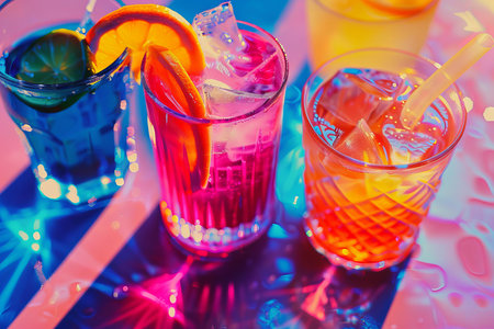 Colorful cocktails with ice and fruit slices on a luminous neonlit table