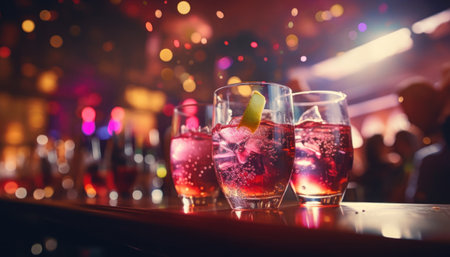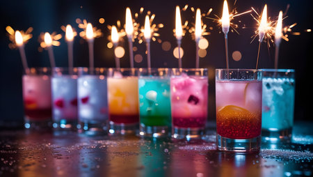 A row of radiant cocktails on a bar, with ambient lighting accentuating the drinks, capturing a festive nightlife atmosphere.
