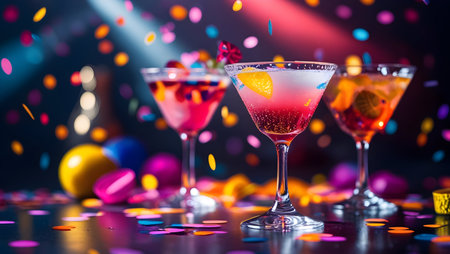 Colorful Neon Galaxy Drinks. A vibrant scene featuring three colorful cocktails with festive decor