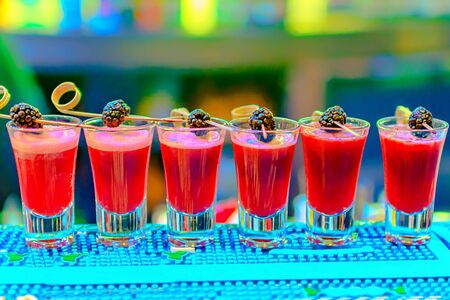 Red alcoholic cocktail in six glasses decorated with blackberries on a stick. Freshly prepared cocktails on the bar