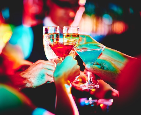 Close up of two people cheering cocktails in bar or disco club drinks and cocktails concept