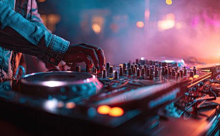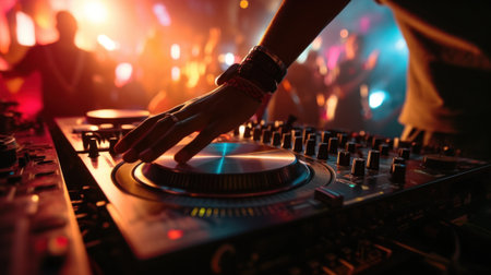 A DJs skilled hand expertly adjusts the various controls amidst vibrant neon lights and an energetic atmosphere. Generative AI