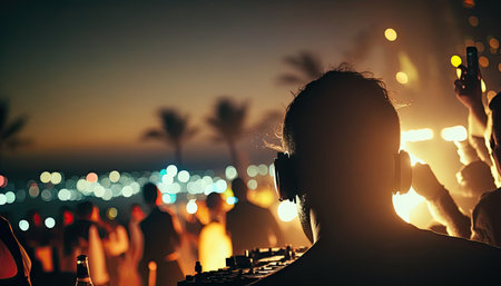 DJ immersed in his performance during sunset, with an enthusiastic crowd dancing and celebrating against a picturesque seascape backdrop