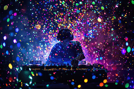 DJ immersed in music surrounded by vibrant confetti explosion at nightclub event AI