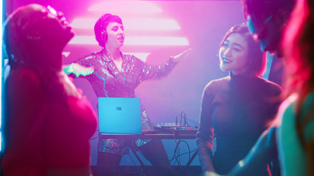 Funky female DJ mixing sounds on stage at club, dancing with group of friends at audio station. Young woman jumping with diverse people, enjoying night out at nightclub party. Tripod shot.