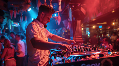 DJ Mixing Music at a Vibrant Nightclub Party with Colorful Lighting.