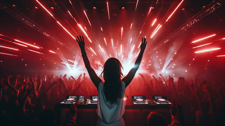 Energetic nightclub atmosphere with DJ performing in vibrant red lighting among enthusiastic crowd. Generative AI
