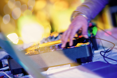 Close up view of DJs hands that working with music equipment in the club with neon lighting