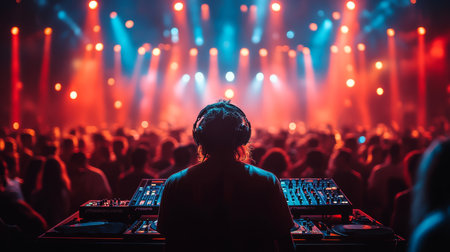 A dj mixing music in front of a crowd of people. Generative AI image.