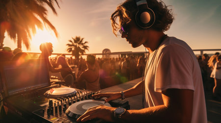 Disc jockey mixing music at sunset during a festival with crowd partying in front of the stage