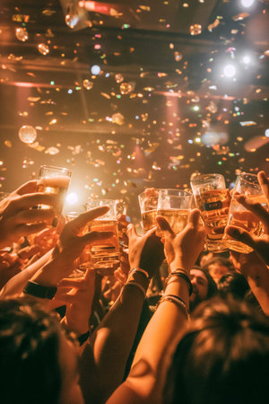 A group of people are celebrating with drinks and confetti. Scene is festive and joyful