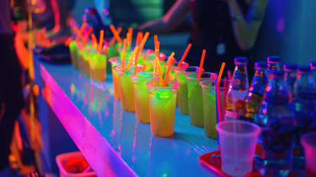 A makeshift bar set up with an array of nonalcoholic glowinthedark drinks complete with neon straws and plastic cups