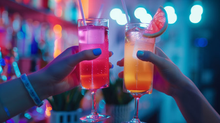 People toasting with colorful cocktails at a festive gathering