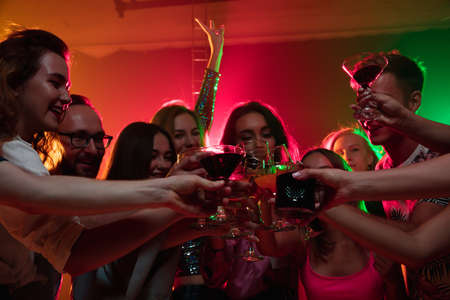 Party with alcohol. Group of young friends smiling and making a toast in the nightclub.