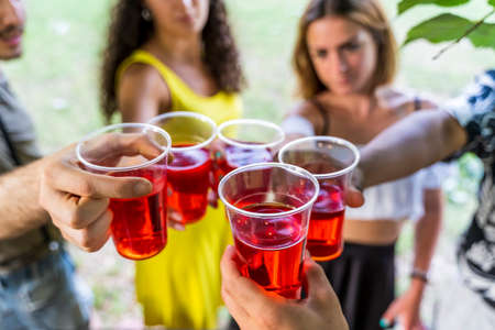 Close up of friends clinking various alcohol glasses while enjoying outdoor party