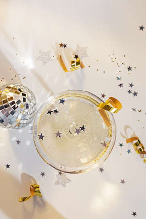 Glass of champagne in a coupe with mini disco ball