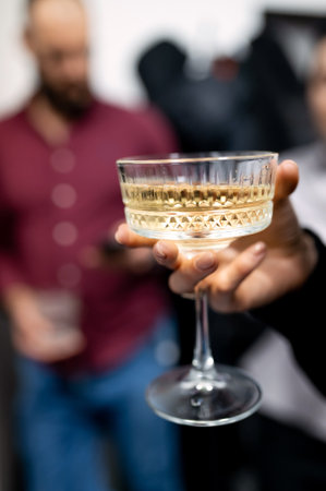 A close up of a man's hand who is dressed in formal attire and holding a martini glass on party background
