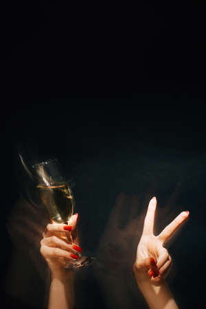 Cool party. Festive background. Holiday celebration. Female hands showing victory gesture holding glass of champagne defocused light long exposure isolated black copy space.