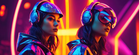 Side view of two young women in headphones looking at camera in neon light