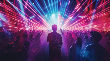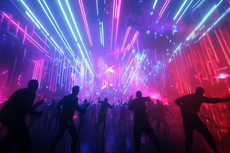 Fun in night club with laser light. Silhouetted Figures at Futuristic Light Show with Glowing Particles