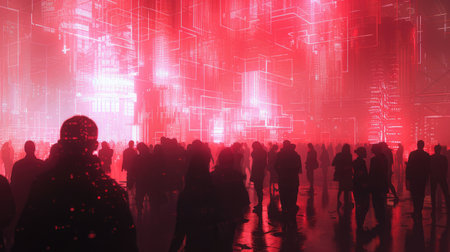 A silhouetted crowd observes dynamic red and blue light trails weaving across a dark backdrop. The composition features a low-angle perspective with a distinct division between the figures and the vibrant light display. Potential uses could include promotional material, artistic projects, or creative visuals for various media.