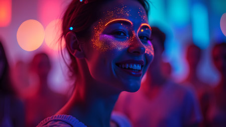 Close up of a woman with neon makeup smiling at a party. The background features blurred people and lights.