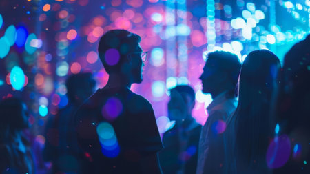 A group of individuals engaged in virtual reality amidst a colorful, illuminated environment