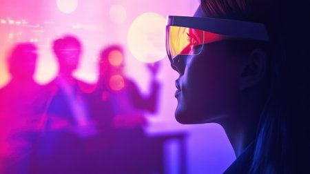 A couple of people standing under a neon light. Futuristic glasses.