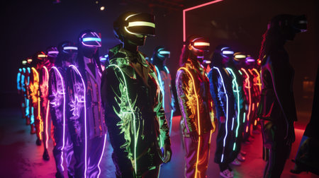 Neon-Lit Group in VR Helmets at Night