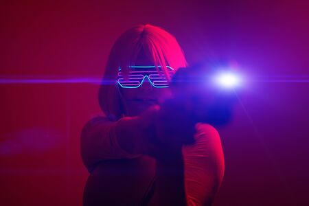 Girl with blaster in the futuristic battle. Concept virtual reality, cyber game.