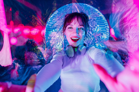 Happy smiling woman in white clothes dancing in neon disco ball light and extends a hands inviting you. Music lover. White dress code party, disco. Enjoy moment on shiny background. Selective focus.